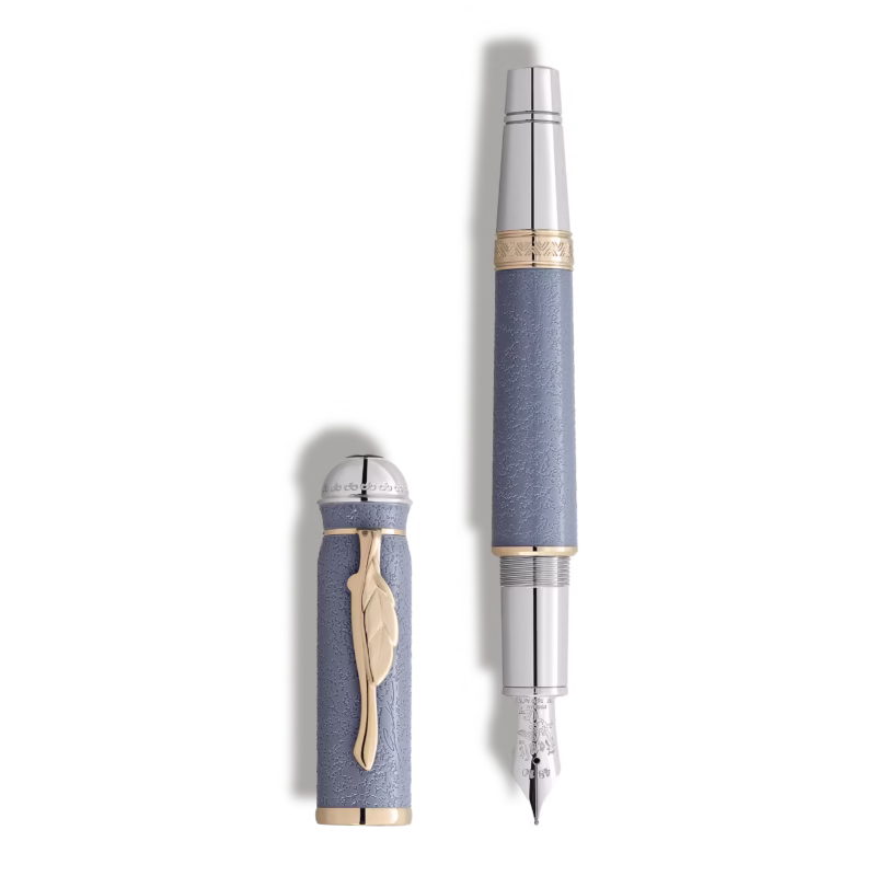 A further key design feature harks back to Goethe’s house in Weimar. The shade of blue and the pattern of the precious lacquer reflect the colour and structure of the wallpaper in the Juno room in the writer’s home. The signature gold-coated and platinum-coated fittings are also reminiscent of other decorative elements in the interior. A charming pattern akin to a string of clover leaves is engraved around the cap top. This detail originated from a letter written by Goethe to his beloved Charlotte Buff, the model for the figure of Lotte in his The Sorrows of Young Werther.